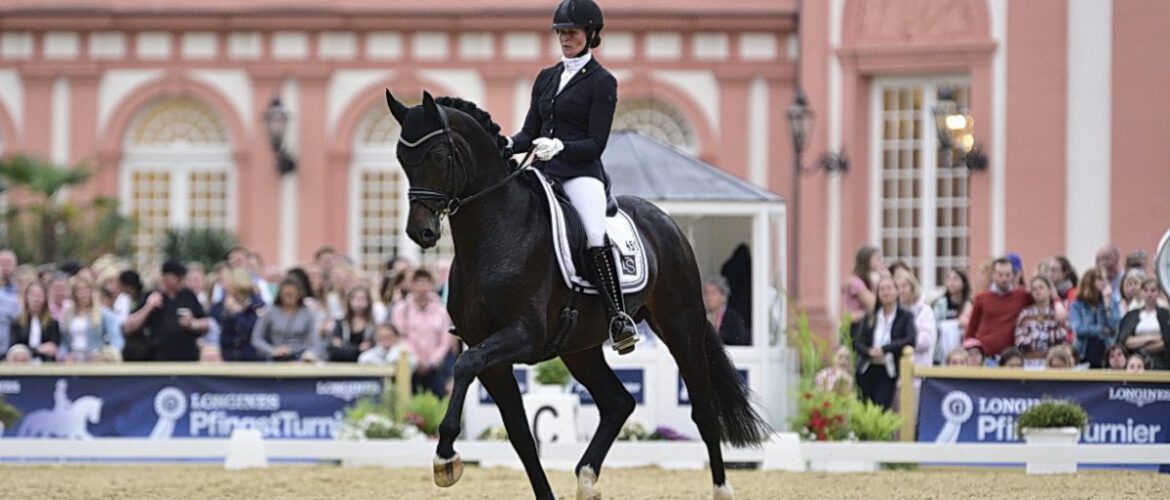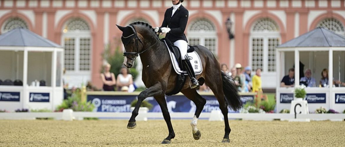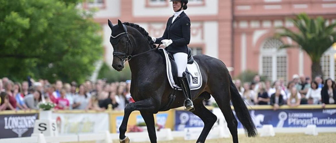 Die beiden 6-jährigen Burghof-Hengste DSP De Sandro (Decurio – Samba Hit | Züchter: Hans-Adolf Lempke | Besitzer: Dressurhengste Schleier) und Flashback (Franziskus – Sir Donnerhall | Züchter: Christian Bürki / Schweiz | Dr. Schleier/Burghof Brodhecker) haben mit ihren Auftritten beim diesjährigen Pfingstturnier in Wiesbaden Biebrich gezeigt, dass sie auch auf dem internationalen Parkett wirklich mithalten können. Vor atemberaubender Kulisse verstand es Carolin Brandt die beiden typvollen Junghengste ausdrucksstark und effektvoll in Szene zu setzen und wurde dafür mit zwei tollen Platzierungen belohnt.